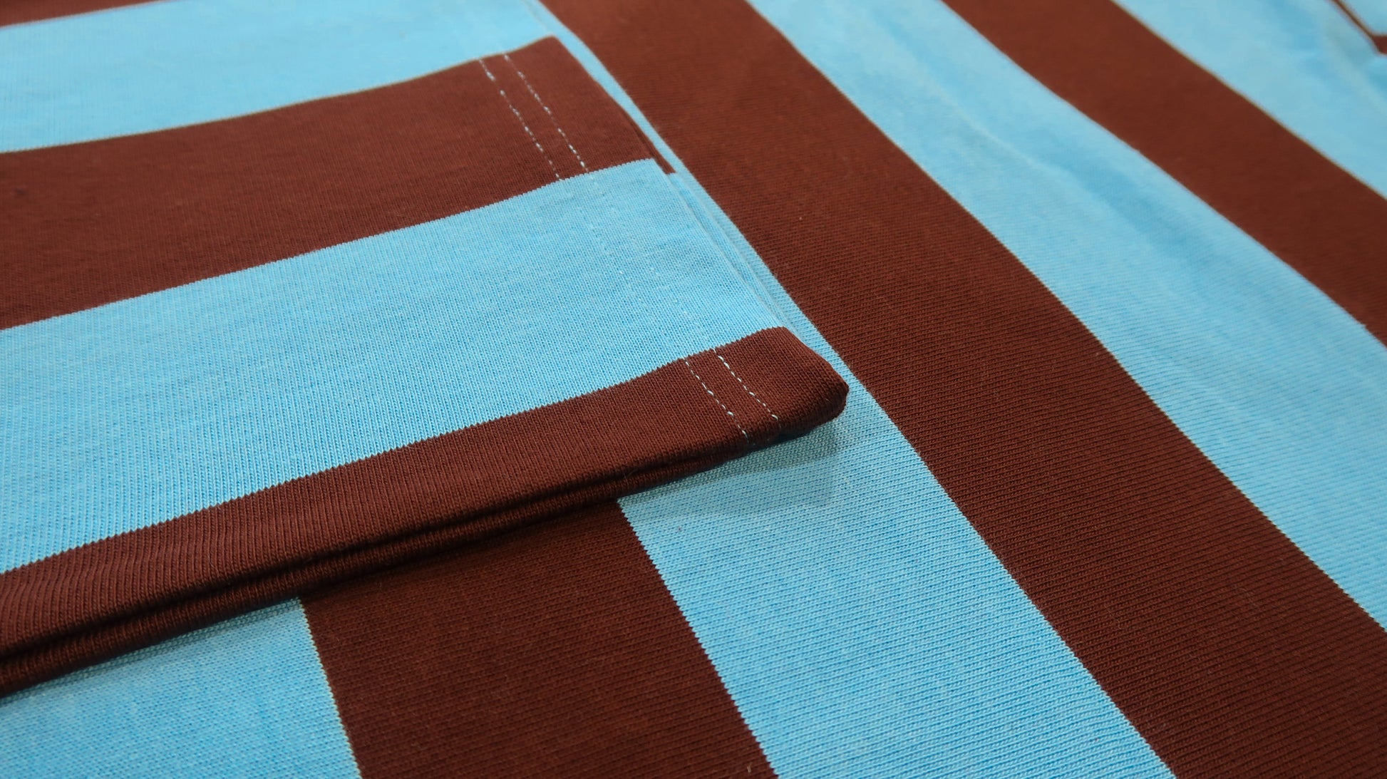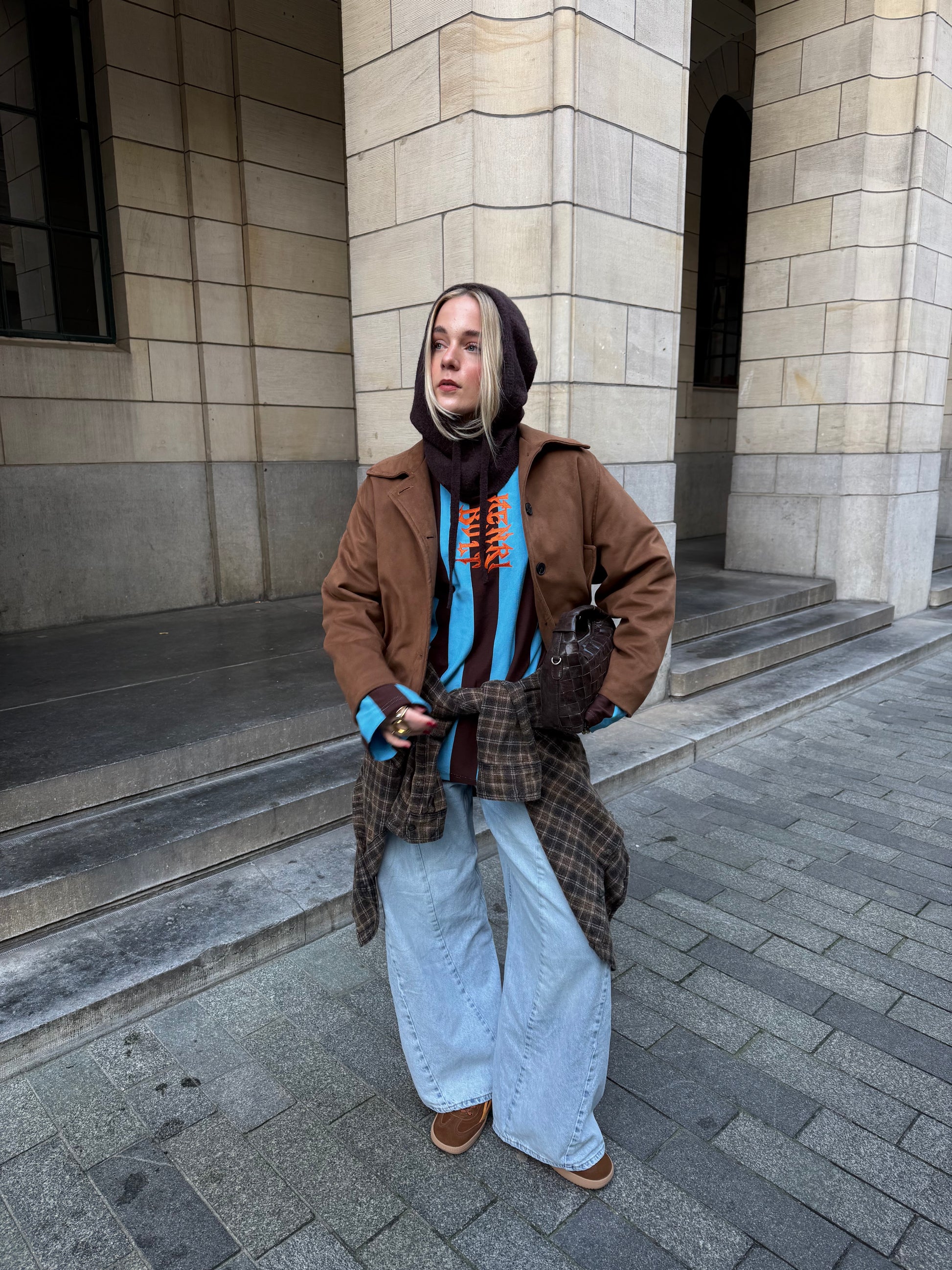 The blue and brown longsleeve is the fifth release from our Striped Capsule, part of the Pray Before Dinner collection. Its vertical stripes make it a unique statement piece. On the front, Henri Bolt is embroidered vertically in popping orange. The collar shares the same color, creating a clean, unified look. With wide sleeves and an oversized fit, this piece instantly stands on its own as a full outfit.