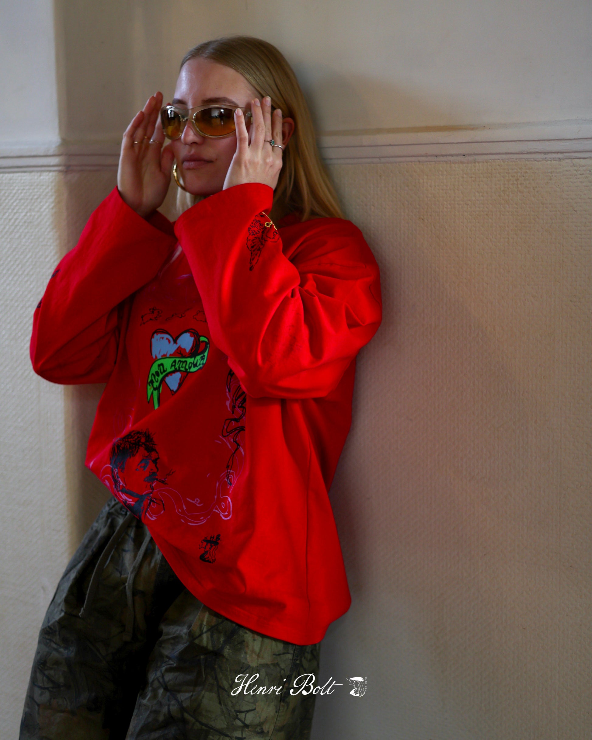 This is a unique piece from the Love Collection Part II. The shirt features a deep red color with contrasting screen prints. This is one of our favorites because, with its oversized fit and wide sleeves, it is a garment on its own. Easy to combine with anything, in every season.